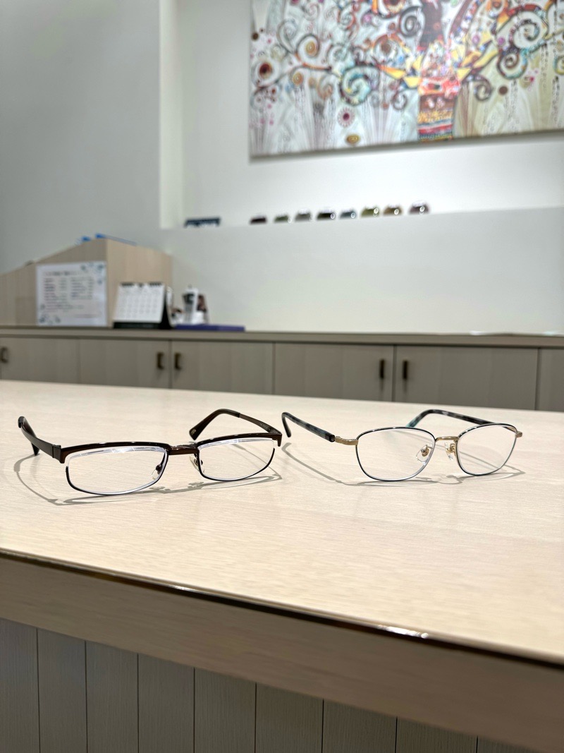 右が金縁スリムなプライベート用メガネ フレーム+レンズ=64,000円