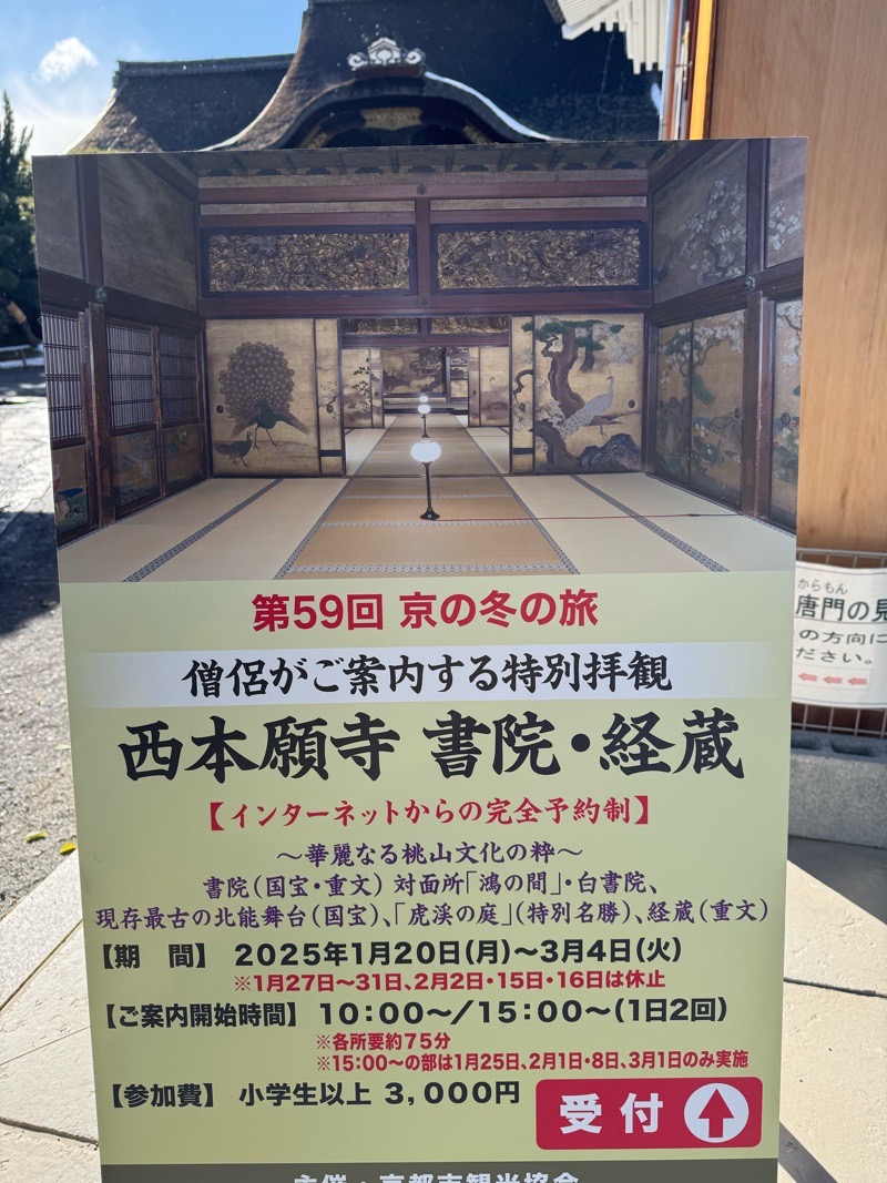 すると偶然にも「京の冬の旅」僧侶がご案内する特別拝観「西本願寺 書院・経蔵」とあるツアーを発見し申し込み