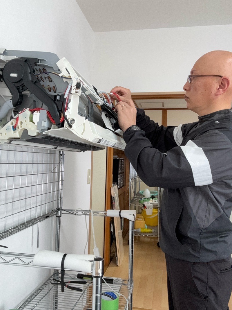 こちらが「エアコンクリーニングの研修の様子」 写真は*お掃除付きエアコンの分解の様子*線が多い!