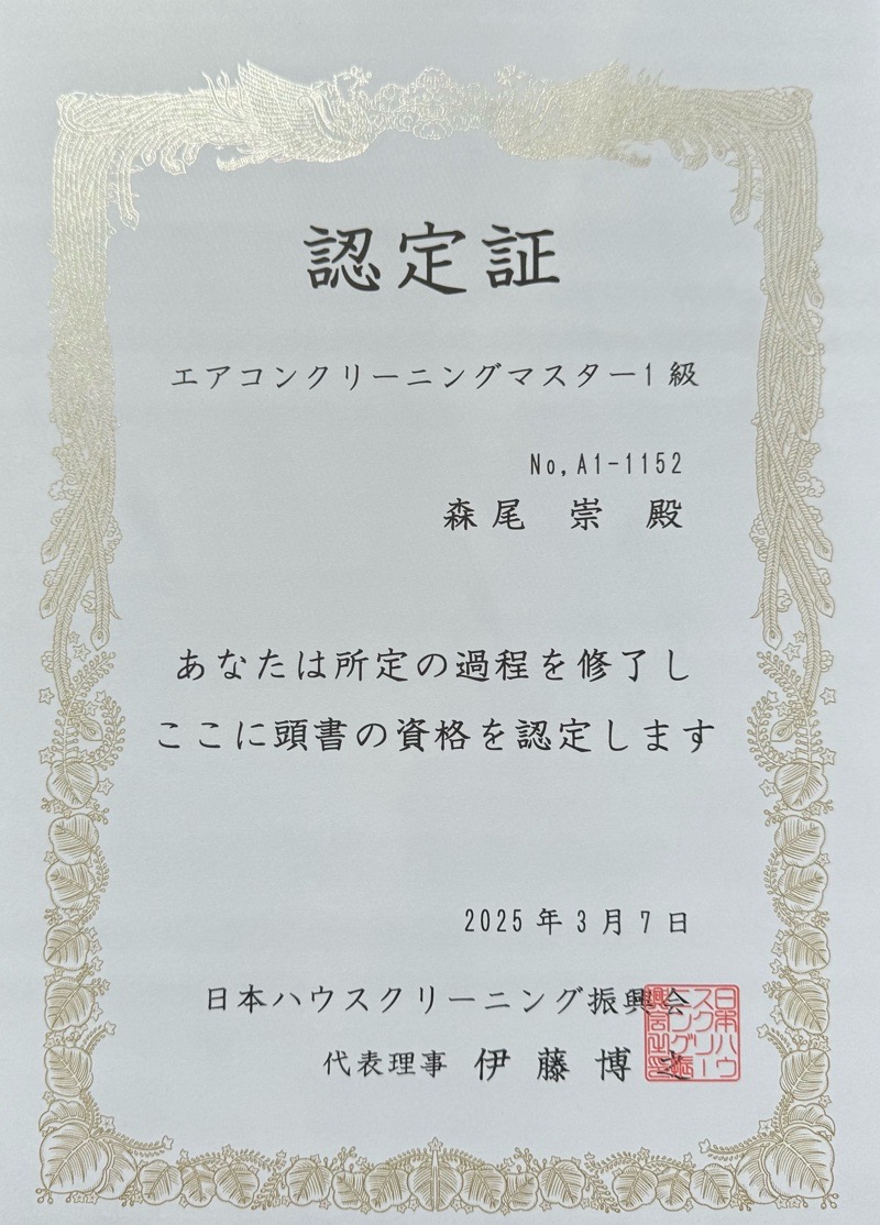 この研修を経て、無事に[エアコンクリーニングマスター1級] [ハウスクリーニングマスター1級]の認定を