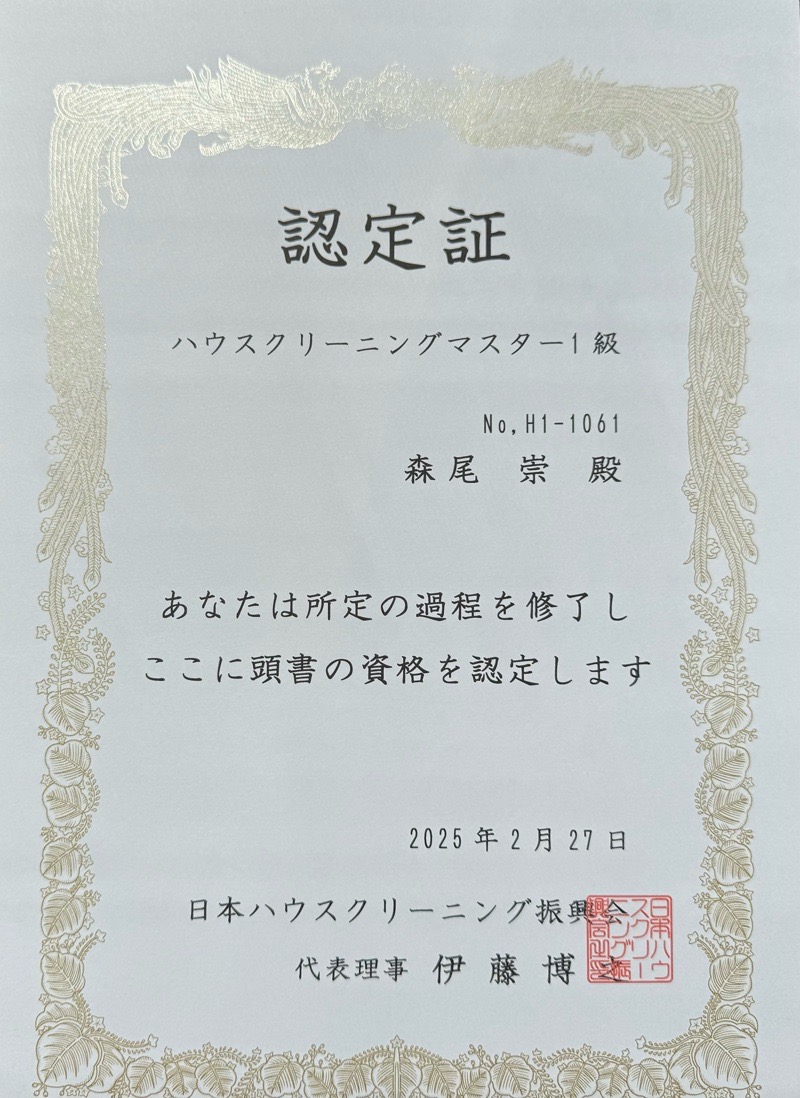 これからは資格を持つプロとして皆さまのお宅に安心と清潔をお届けする準備が整いました。