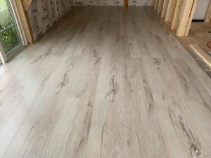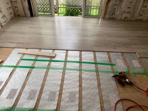 ↑苦節2~3日ようやくリビングの床が張り終わりました。 建材のフロアーですが、木の模様や節の様子が