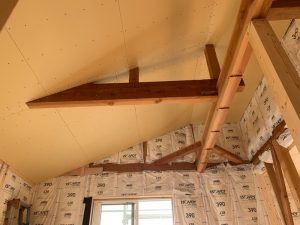 構造用合板12㎜を張り下地が完成。その後ルーフィングを張り雨対策まで完了。次は板金屋さんが新しい屋根材を