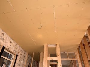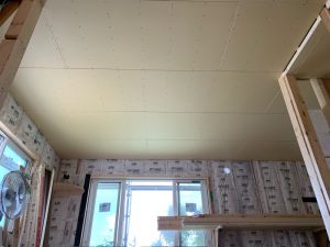 天井に新しい石膏ボードを張って行きました。クロス仕上げの下地材となります。千鳥張で施工です。