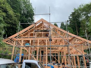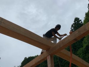 ↑高い所に登り、梁や桁材をカケヤで叩き収める、嶋岡君。かなりの活躍でした。