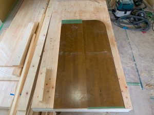 必要なサイズにカットし、二枚の板を段差、隙間なく一枚の板にくっ付けます。 意外と難しい作業。