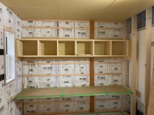 そのころ、嶋ちゃんはリビングでワイド本棚とデスクをフリー板で造作してくれております。
