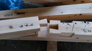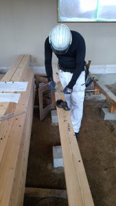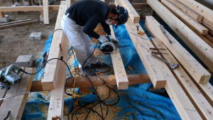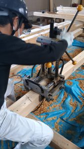 墨付けできた木材のきざみ作業を嶋岡が担当。役割分担することで作業の効率をアップしています。
