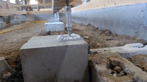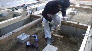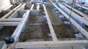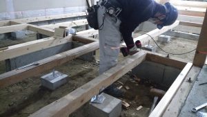 ↑土台はアンカーボルトで締固め、大引き土台は、鋼製束を用いて水平に固定していきます。(縁の下の力持ちですね。)