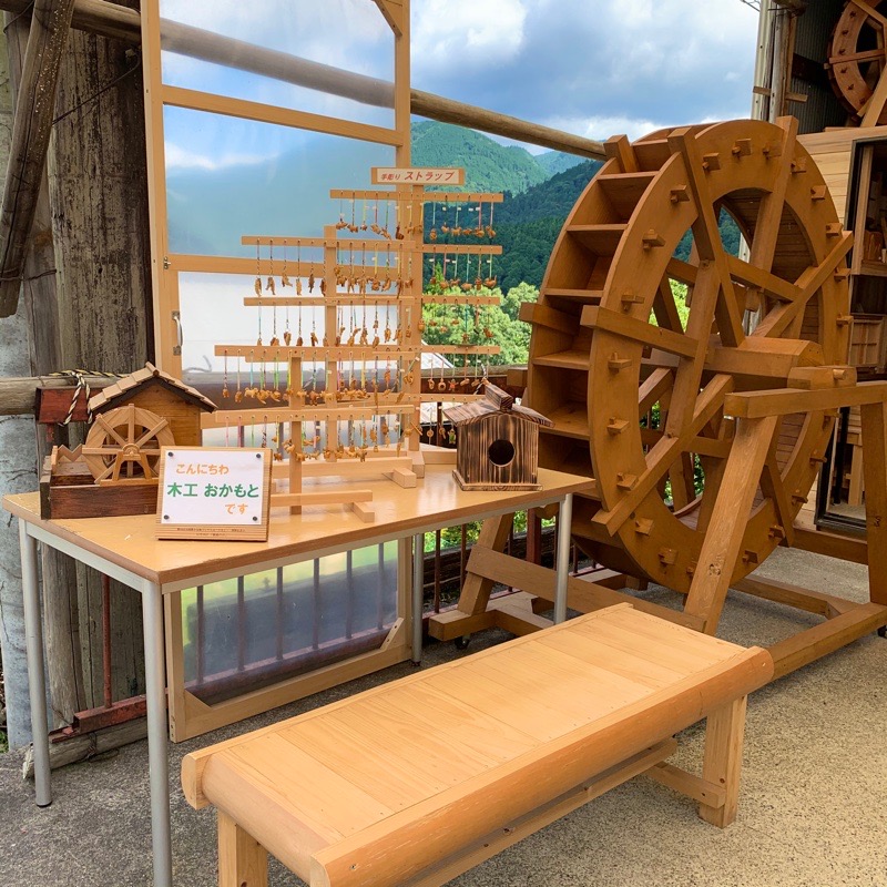 手前の椅子も手作り!  右側に存在感のあるものは「水車」です。