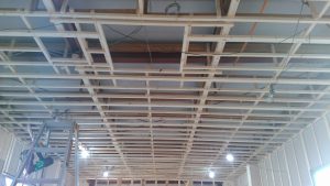 進んでいます。広い集会室の天井の下地工事が終わり、天井の埋め込みエアコンの開口も出来、今日から電気屋さんが配線工事や