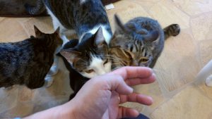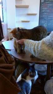 近鉄真菅駅前にあります保護猫カフェミーニャさんへは妻は初めて。妻のカバンの中から一匹の猫がジャーキーの袋を