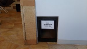 発見!猫のトイレドアです。下のパネルが外れちゃったようですが、愛猫家の方々には憧れのアイテムですね。