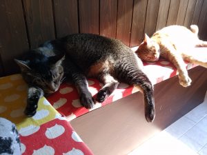 西日のあたる、窓際で猫ちゃんが日向ぼっこ。(猫は暖かい所が好きなうえ、太陽で自ら殺菌をしております)