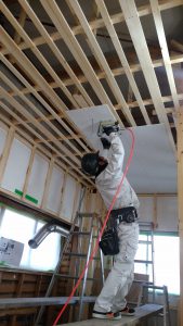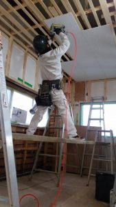 一般の住宅の天井高さが2.4m~2.5mですが、 2.9mの施工です。 高~い。作業床もキッチリ作り、2人での作業と