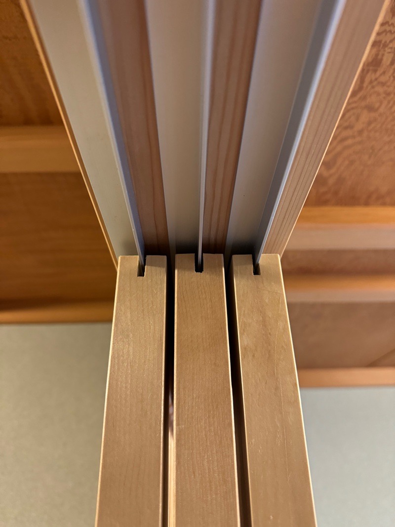 建具に細いレール溝を掘ることでドアを走らせる 「逆転の発想✨」 スッキリ仕上がります。
