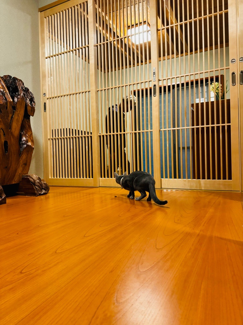あら? 工事中・・猫のリンダちゃんは和室に閉じ込められていて 「ご機嫌ななめのお顔です」 😿