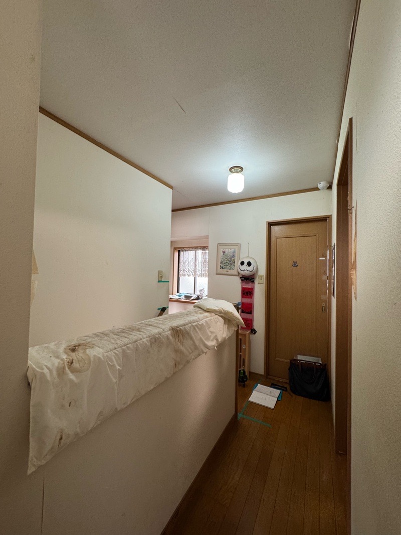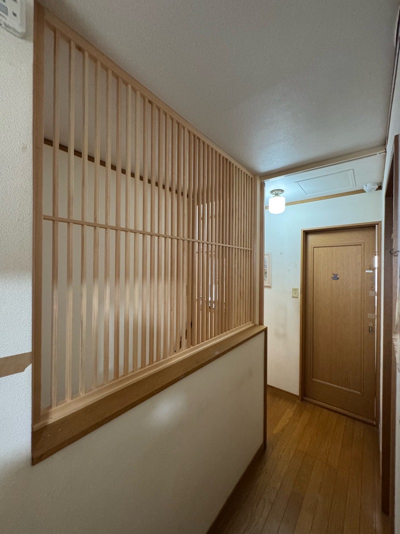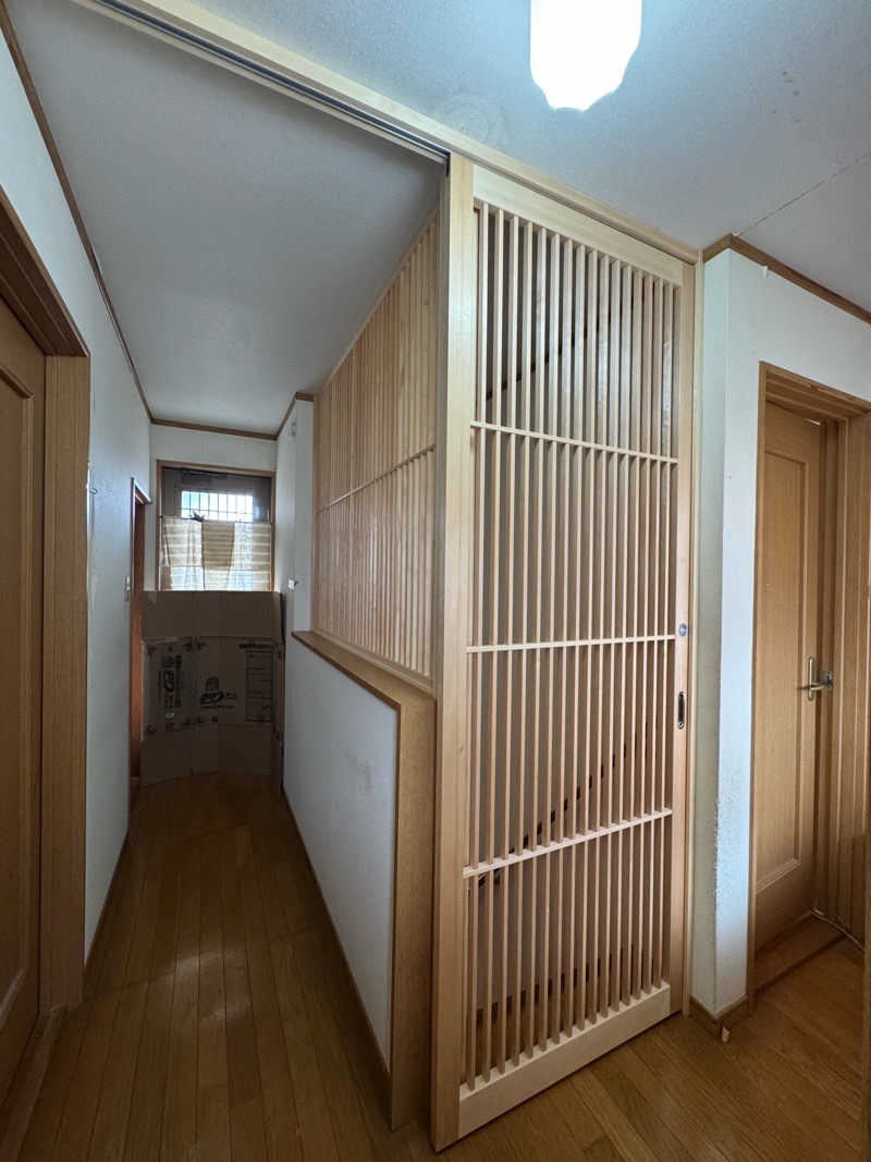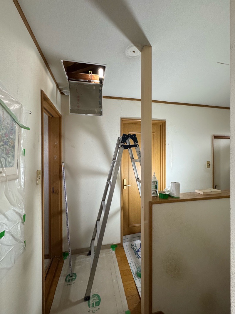 事前工事として 1.天井点検口を設置し照明器具の移設を 2.柱・鴨居を設置し扉を設置する準備を
