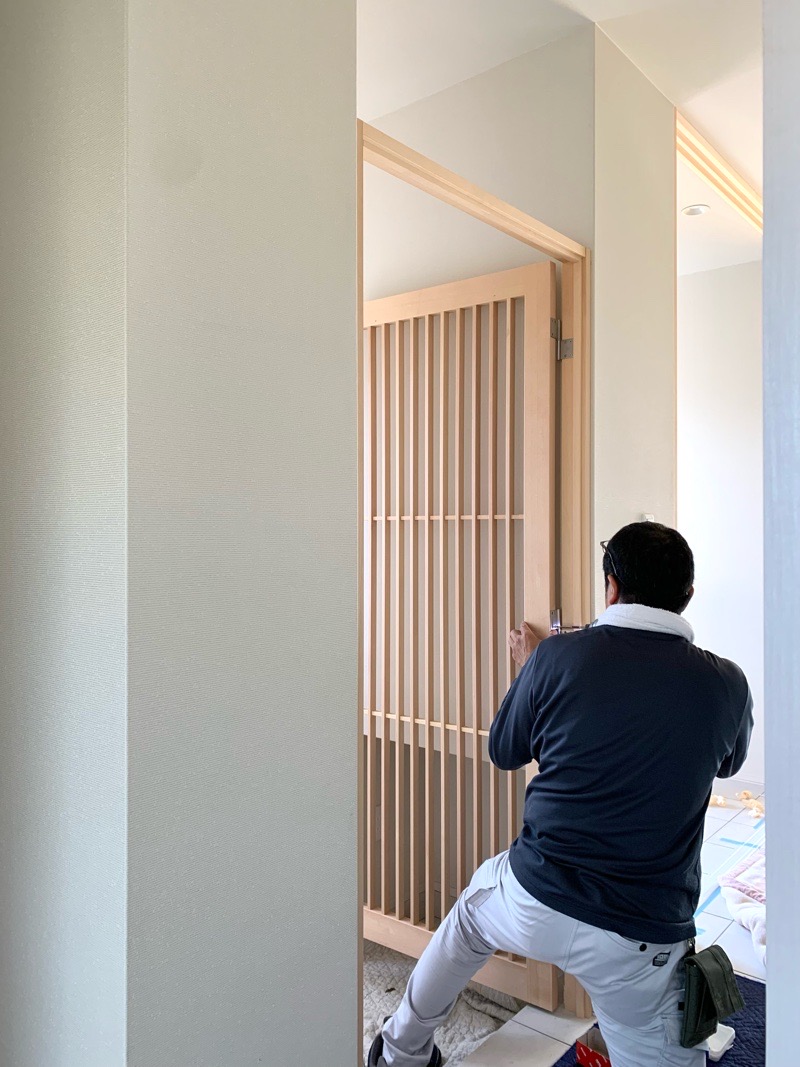 打ち合わせし、制作した建具を切り込んで立てつけ調整していきます。