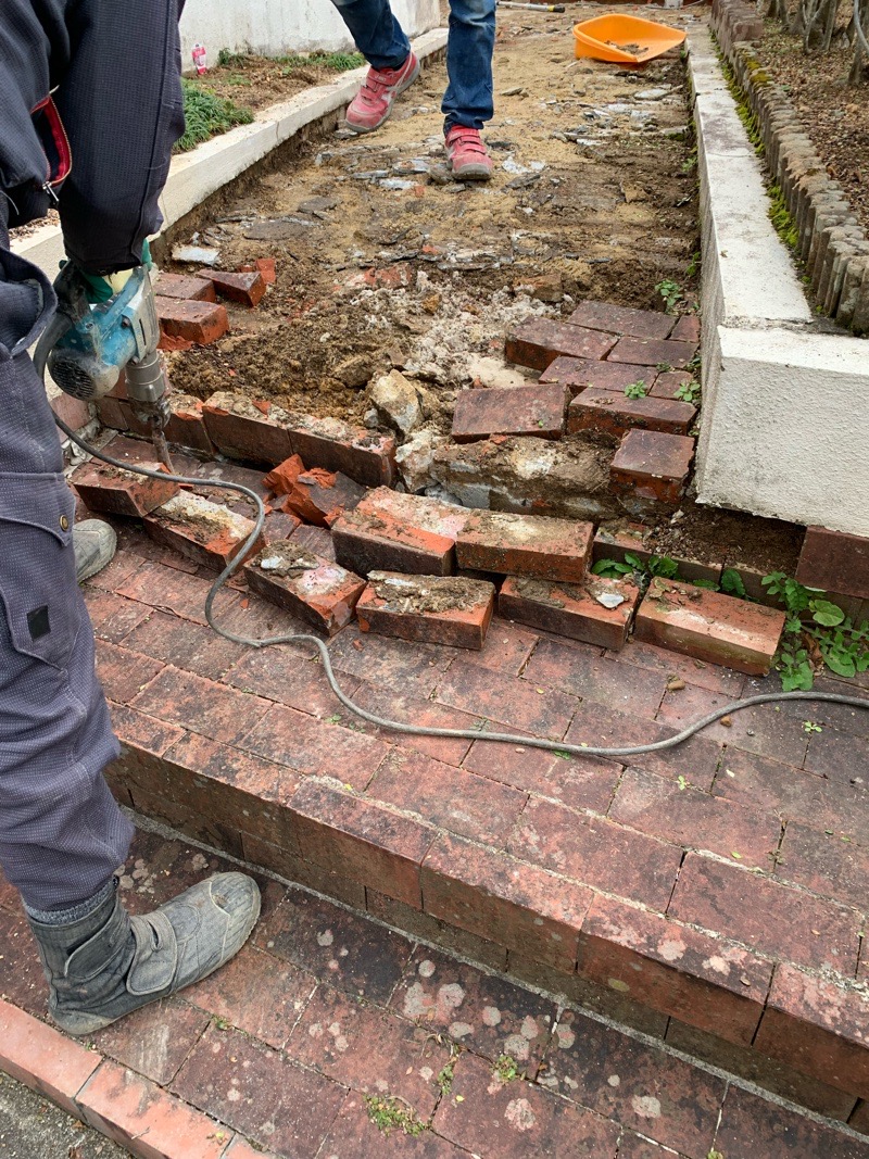 恐らく、レンガの下はコンクリートのベースは無く、土部へ直接施工と想像していました。