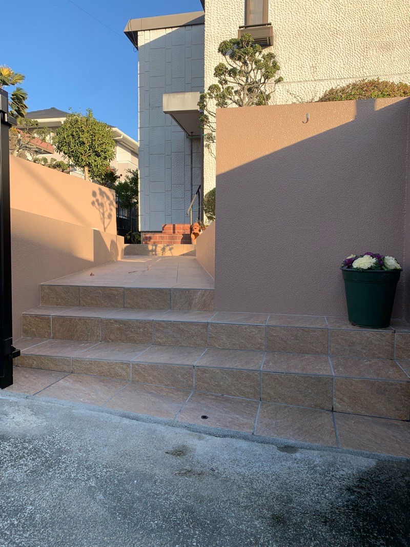 コンクリートのベースを打った上に石目調の30㎝角タイルを選んで頂きました。
