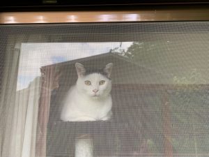後日、自宅へ調査に伺うと、離れ部屋の縁側に白黒の猫が外を眺めています。もう一匹は慌てて隠れましたが