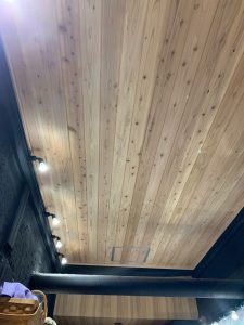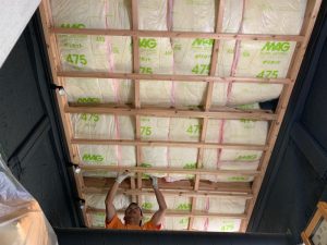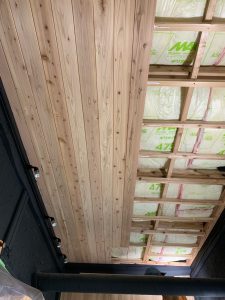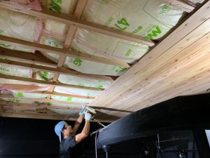 キッチン同様、下地を組み断熱材を敷き詰め、杉板を張って行きます。写真の作業者が嶋岡君です。