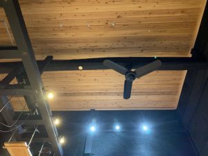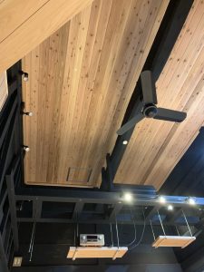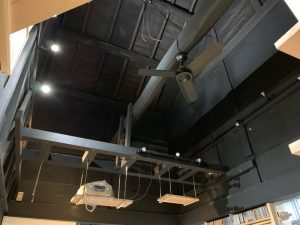 ダイニングの天井の様子です。中央にタイコ梁が露出し、ご主人様の趣味(音楽)音響のアンプやスピーカーが