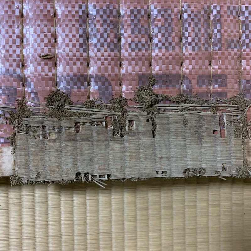 畳の裏に 木の粒?ホコリの固まりの様なものが・・・これ実は、蟻の道と書いて「蟻道」ギドウと言います。