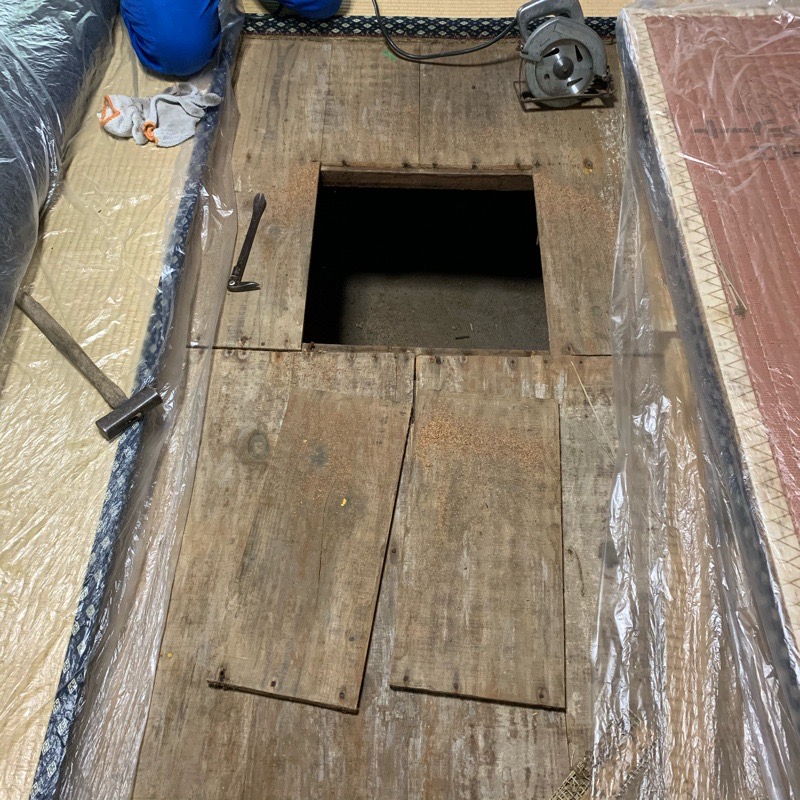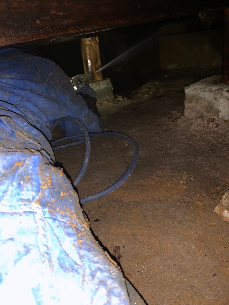 床下への侵入口に和室の畳をあげると、こちらも湿気があります。 よく調査すると・・・