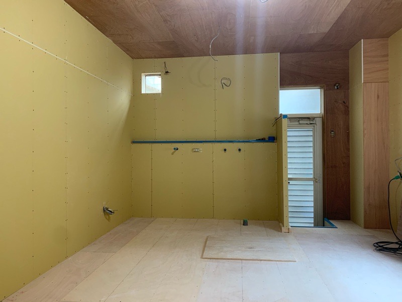 完了していて、次は耐火ボードやベニヤ・パネル類の施工へと移っていきます。