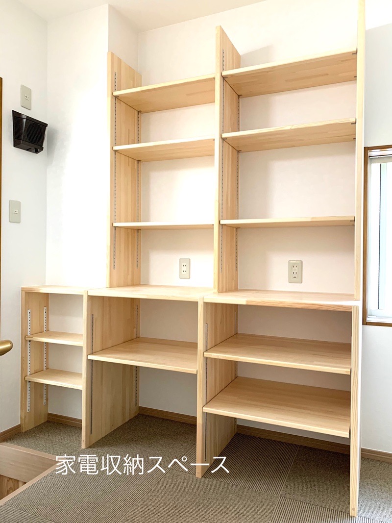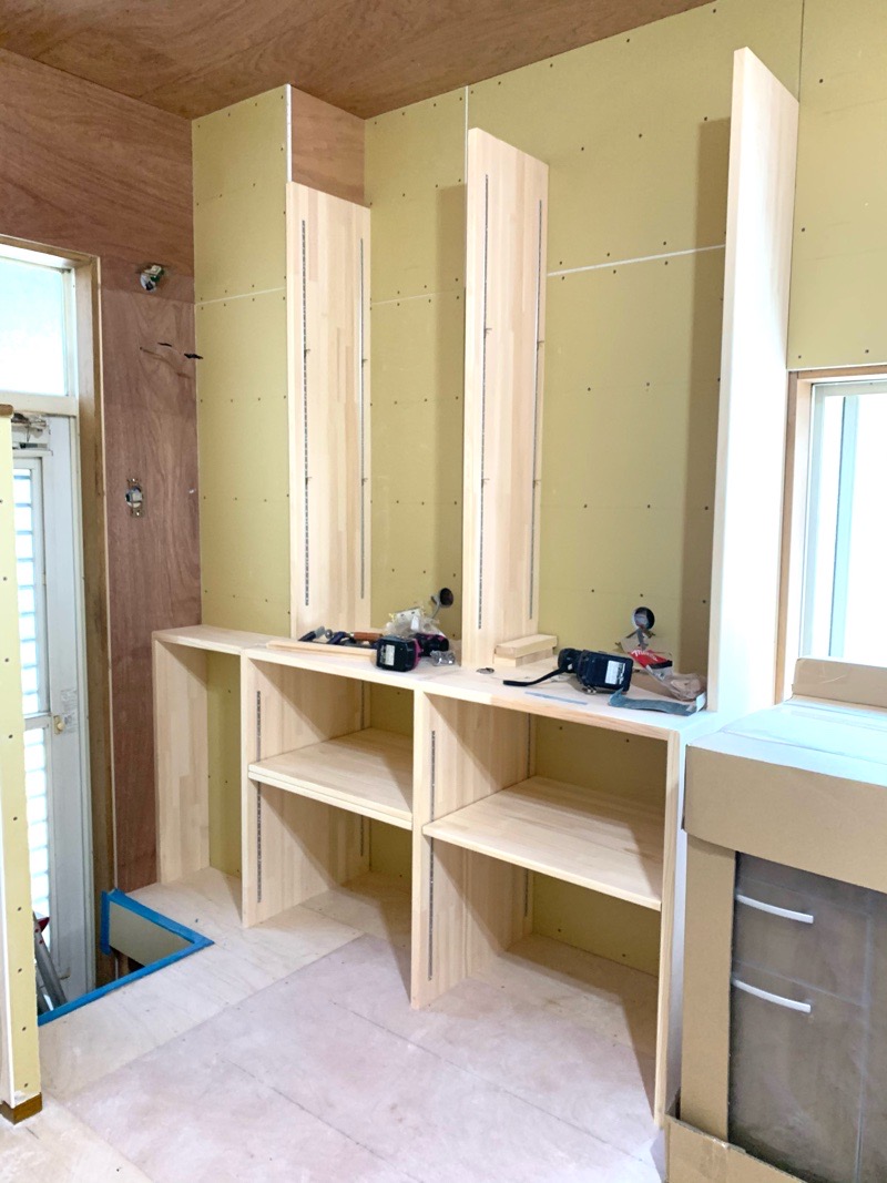 手作り家電収納スペースの形が見えてきました。棚板は、お好きな高さに調整可能な稼動レールを採用しました