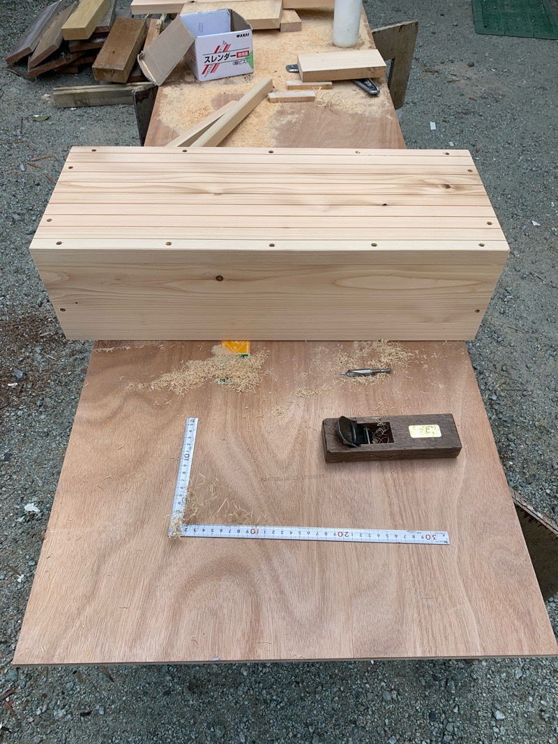 以前、食堂で使われていた桧板の棚板。これを踏み台に再利用していただきましょう!
