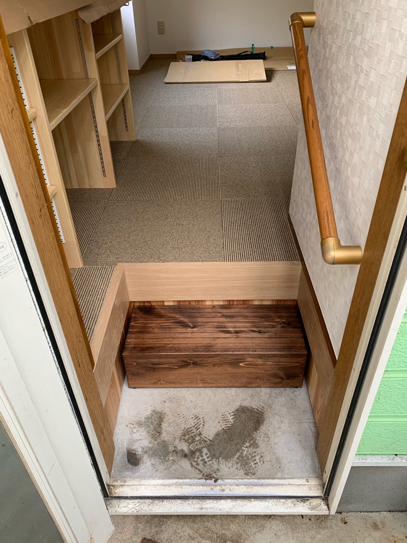 こちらもウレタン塗装をし設置いたしました。合わせて、以前使用していた手すりも再利用させていただきました。