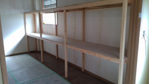 備品を収納する倉庫内には、造り付けの棚を造作していきます。 整理整頓!