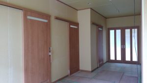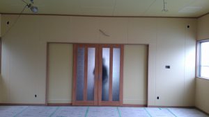 ドア枠も入り、木の部分にも石膏ボードを張り巡らせ